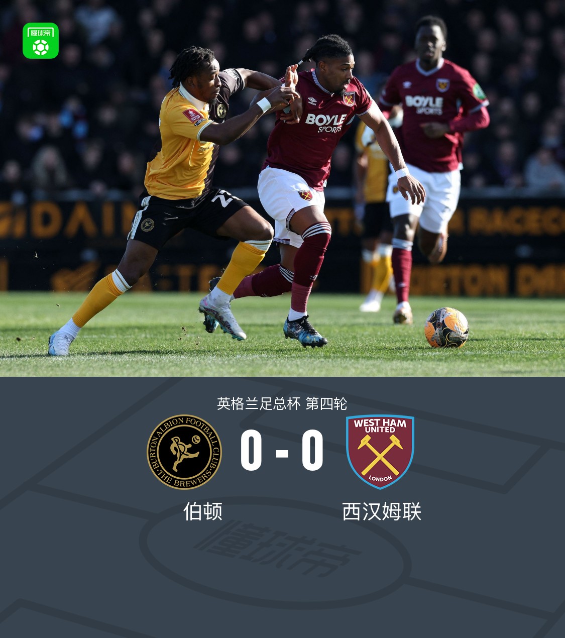 北京时间2月14日英格兰足总杯 第四轮,伯顿对阵西汉姆联。最终比分伯顿 0-0 西汉姆联。