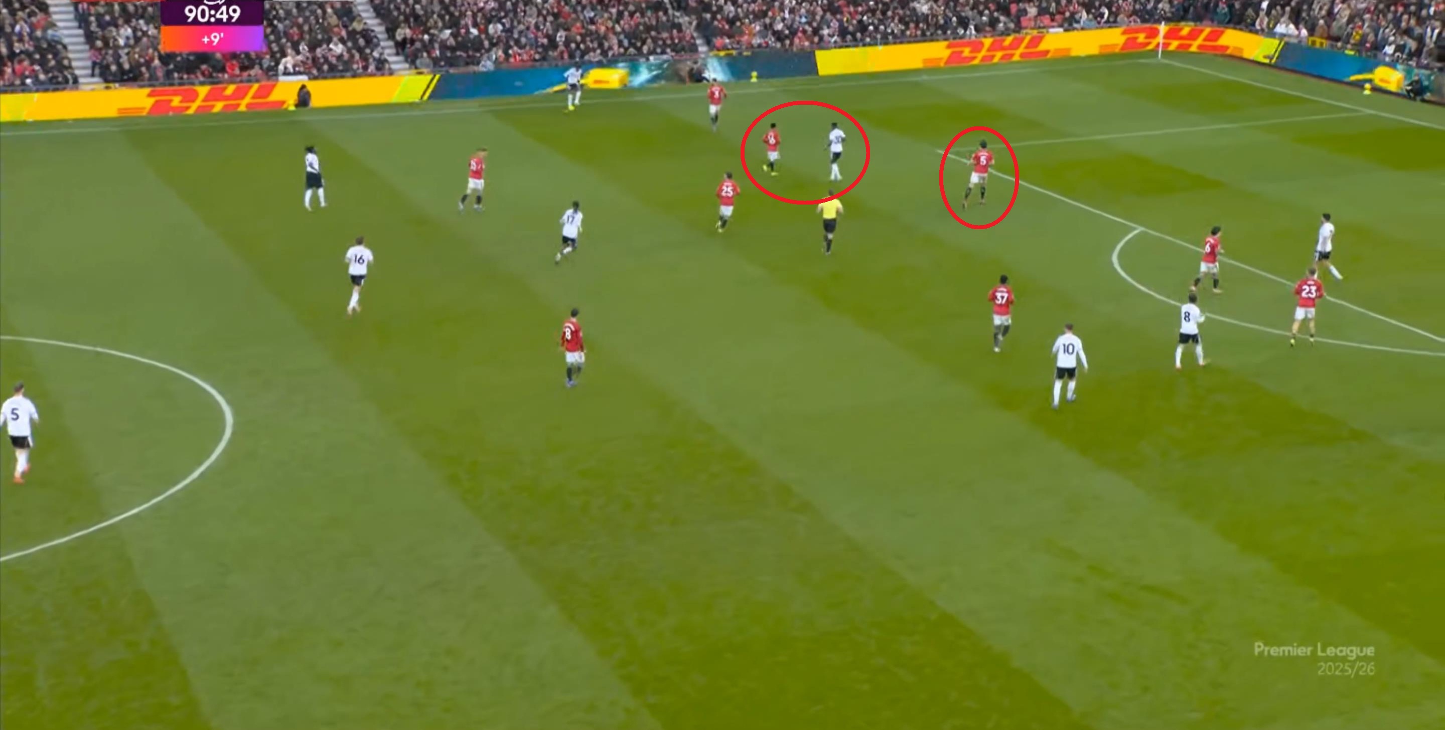 所以,阿玛德-迪亚洛的确防守职责轻微,这也是其在本场比赛经常呈现的样子,但也正是因此,马奎尔的位置不能退得太靠后,你要随时做好阿玛德-迪亚洛防守不力,甚至放弃防守的准备,因为不算阿玛德-迪亚洛的的话,边路等同于二防二。