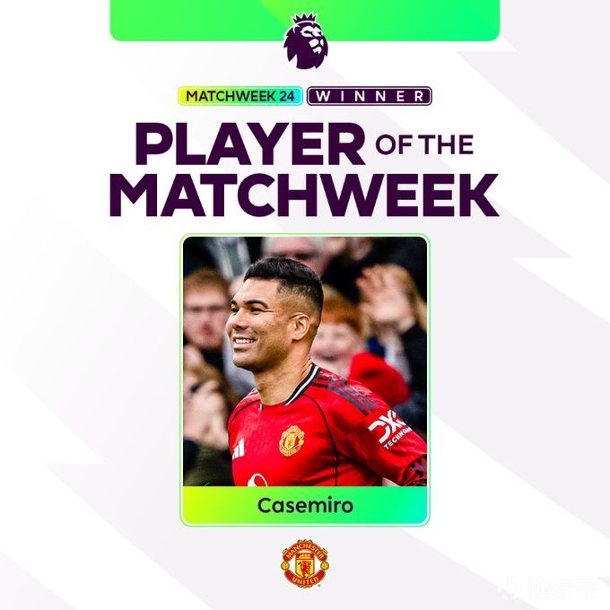 英超官方公布第24轮周最佳球员,曼联中场卡塞米罗当选。至此,英超第21至24轮周最佳已全部被曼联球员包揽。
