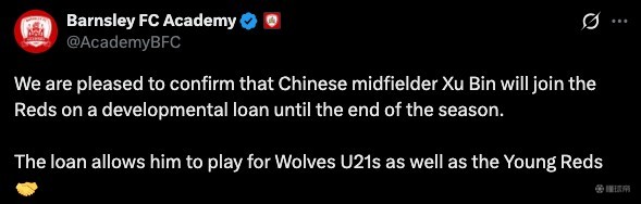 巴恩斯利青训学院的官方公告是:“我们很高兴地确认,中国中场球员徐彬将作为发展性租借球员加盟巴恩斯利,租借期将持续至本赛季结束。这笔租借将允许他同时代表狼队U21及巴恩斯利青年队出战。”