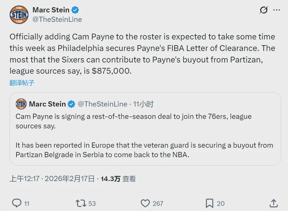 北京时间2月17日,农历大年初一,教主给大家拜年了!最近三天NBA没有比赛,但联盟依然还有不少新闻。今天NBA名记Marc Stein报道,76人将签约后卫卡梅隆-佩恩。佩恩的买断费高达175万美元,但76人最多能付87.5万美元。