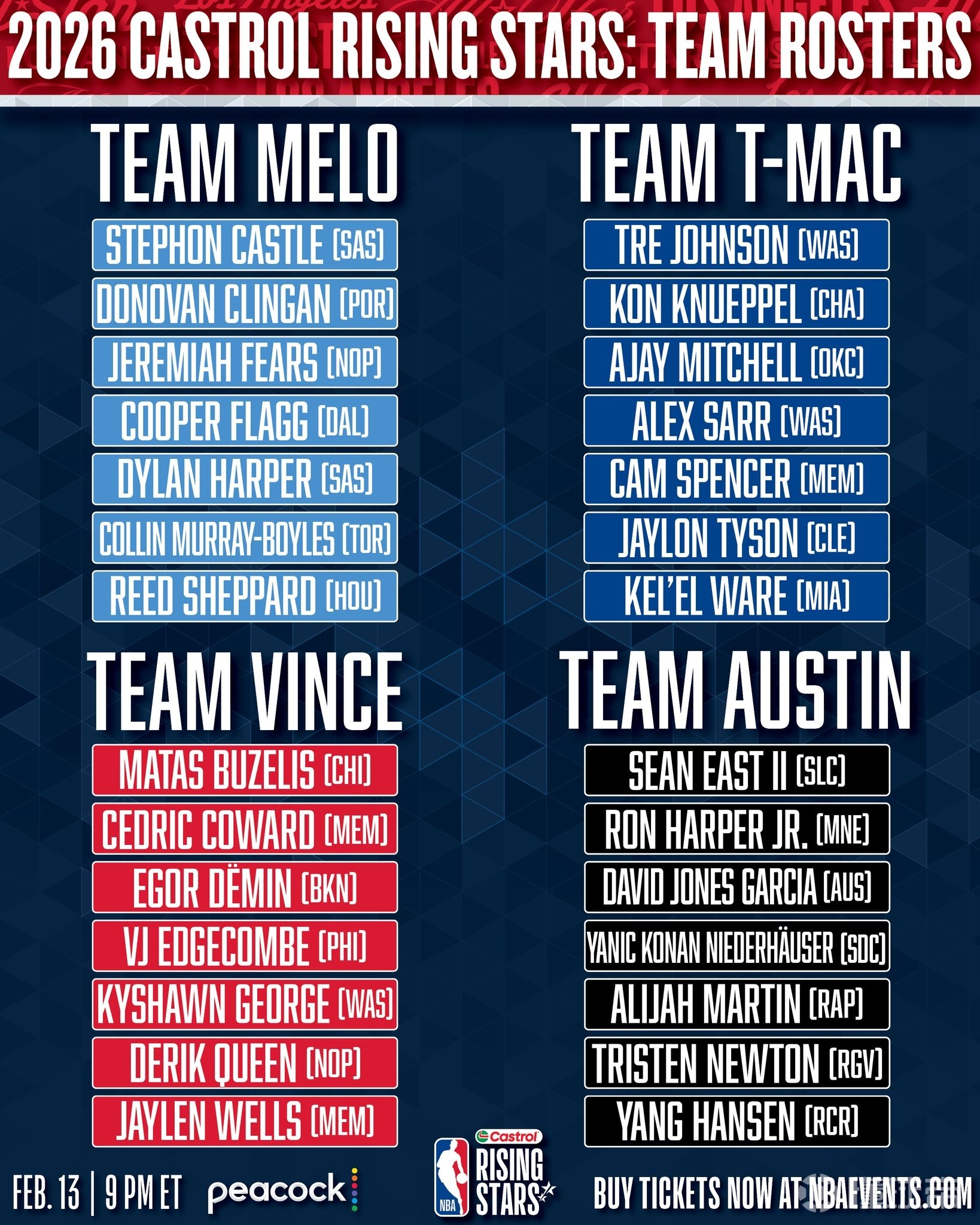 2026NBA全明星新秀赛对阵: