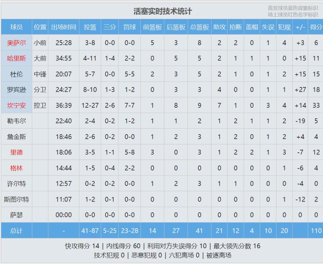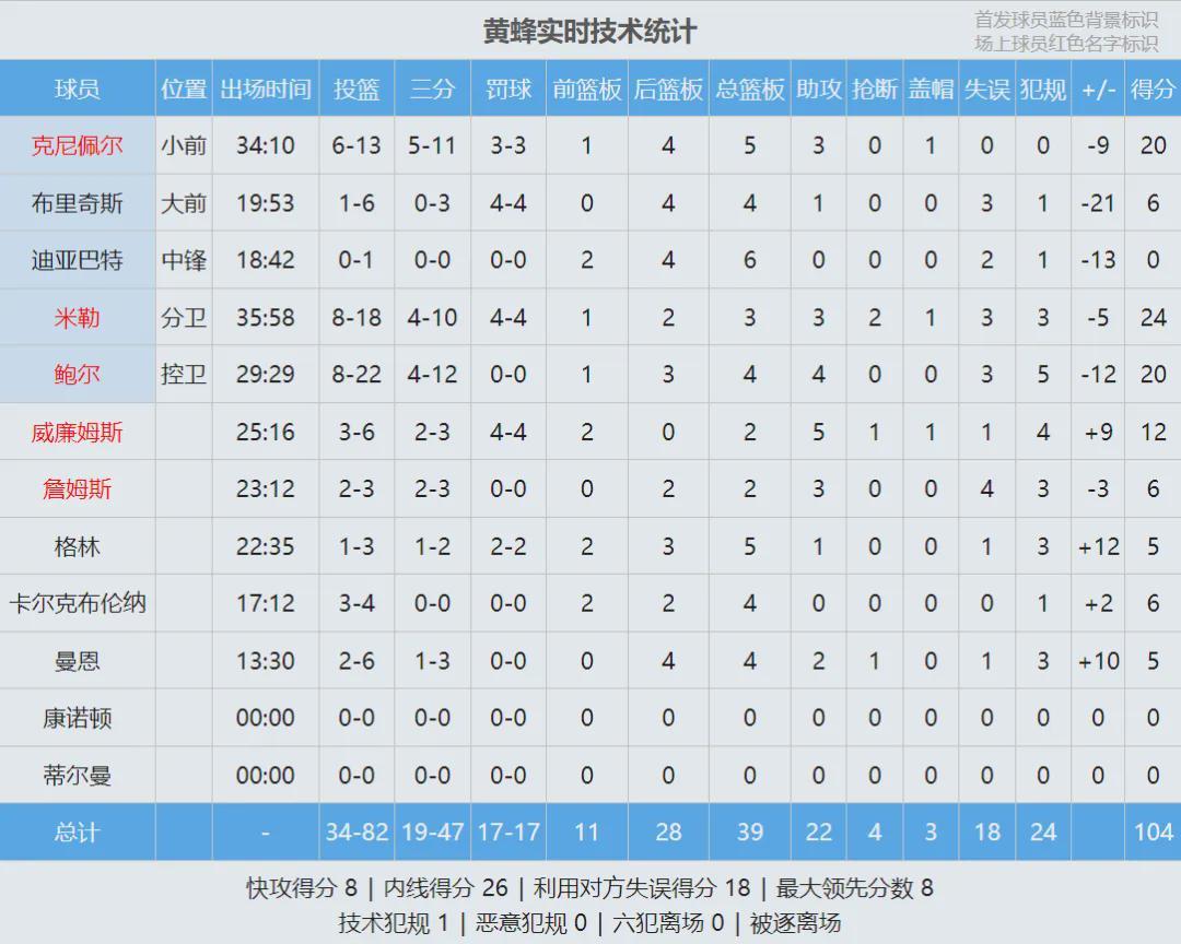 黄蜂的9连胜被终结,最后来看看比赛数据,说说你的心情: